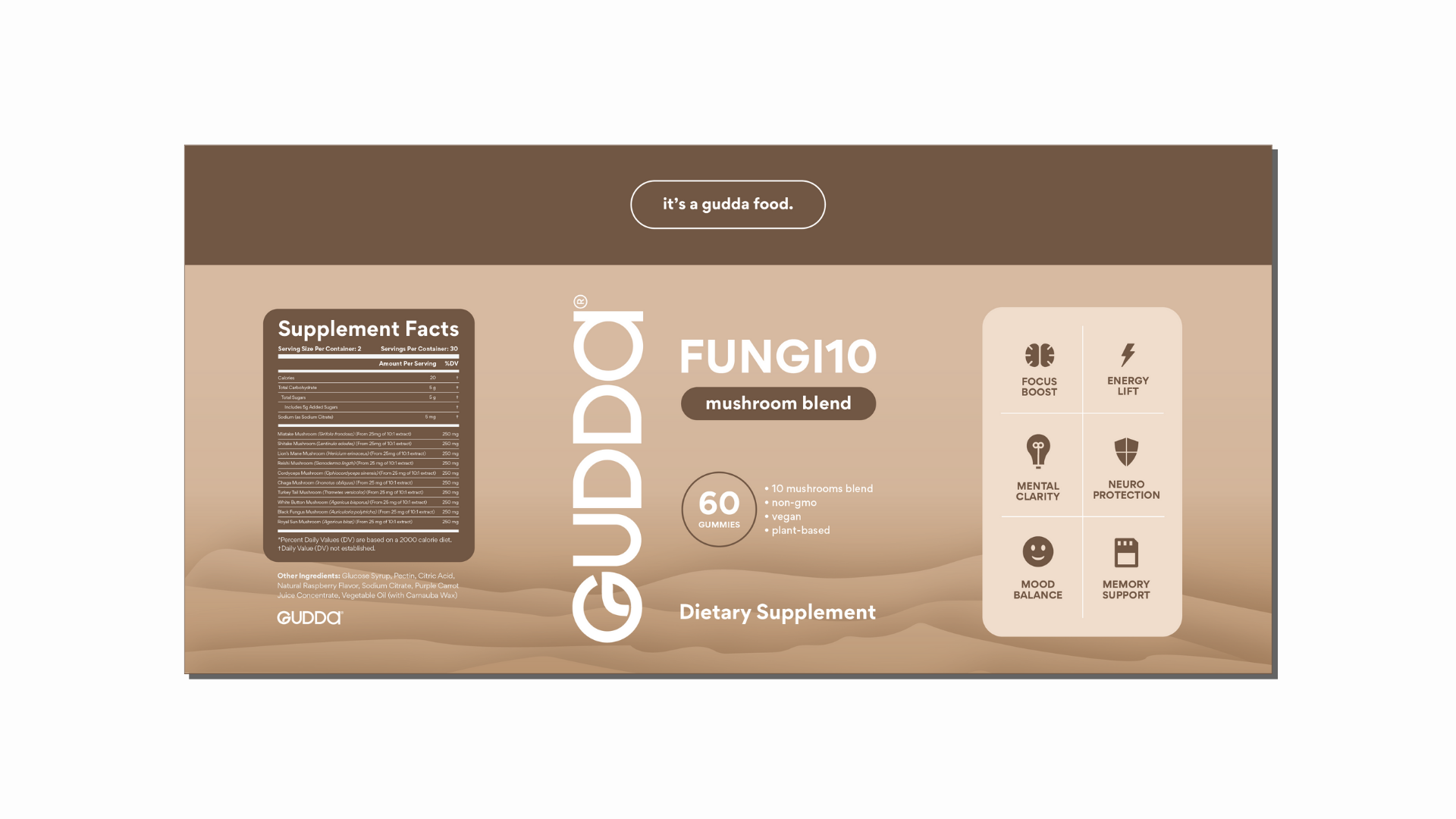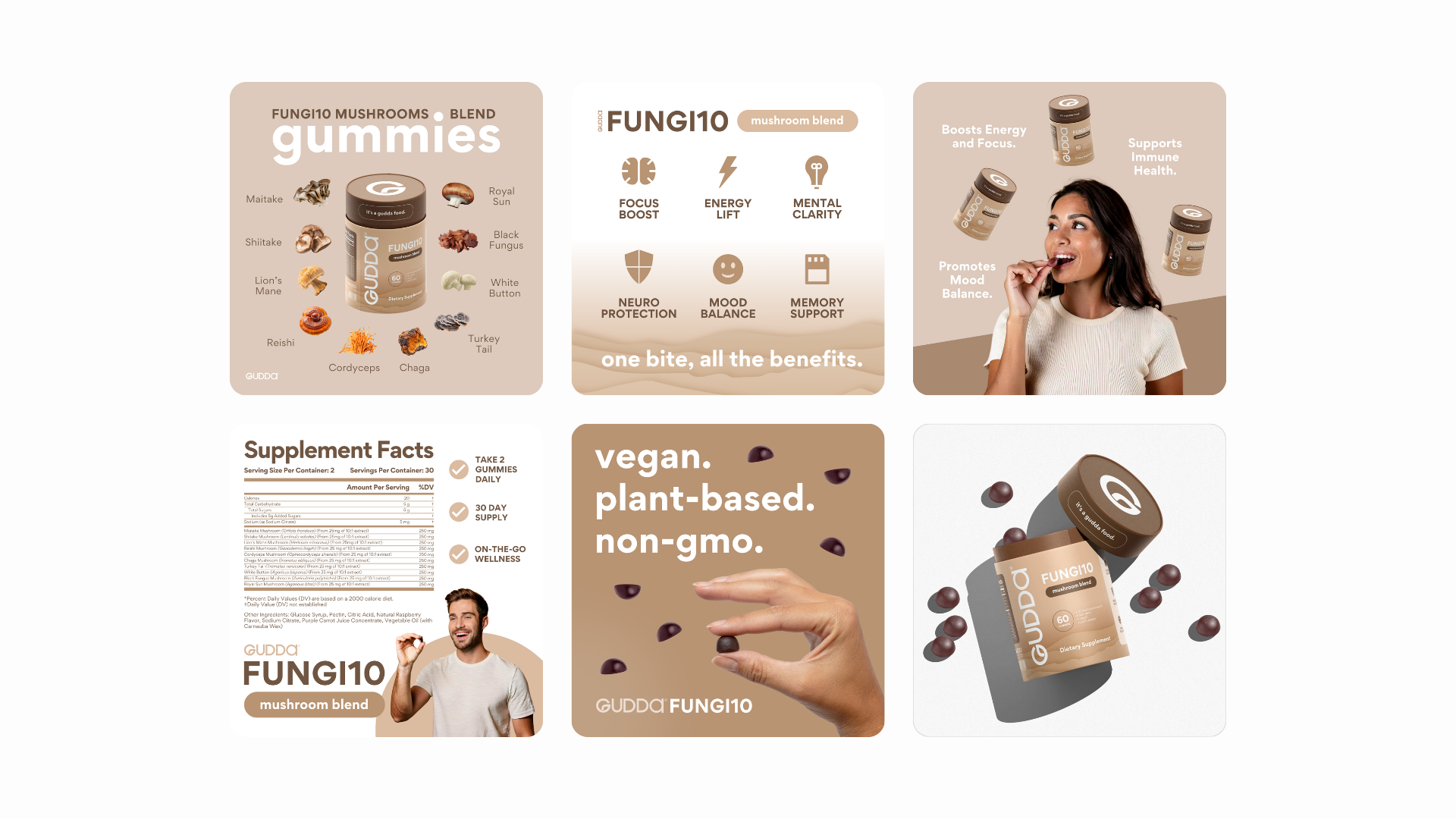 Gudda is a wellness brand built around functional mushroom supplements that boost mood, focus, and clarity — making daily health the easy way. Designed for modern consumers who want wellness without the clinical vibe, Gudda brings playful energy to serious results, helping people feel better from the inside out. The goal was to stand out in a crowded supplement space with something bold, grounded, and genuinely approachable. I created a clean, earthy identity system featuring confident typography, an organic color palette, and packaging designed for modern retail and e-commerce. The result is a cohesive, trustworthy brand with a strong foundation — balancing fun with function and ready for what’s next.